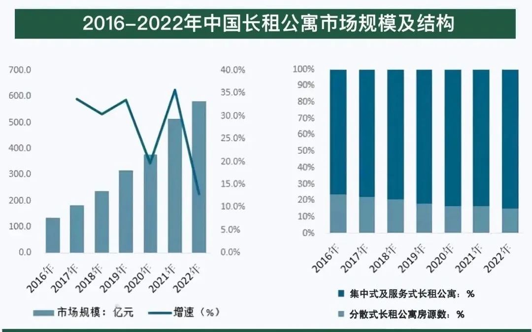 隨著購房壓力大、住房流動性頻繁、新生一代購房觀念的轉變、老齡化趨勢、單身率上升等多因素渠道,整體長租公寓需求量持續增長,加之人均收入水平、消費水平提升,主要基本保障的住房需求消費意愿提升,整體長租公寓市場規模快速擴張,我國長租公寓市場規模從2016年的136.01億元增長至2021年的513.89億元,2022年在疫情影響出租率下降的同時疊加新建長租公寓速度下降,市場規模增速下降明顯,2022年我國長租公寓市場規模約580.39億元,同比2021年增長12.9%左右。細分品類來看,企業集中式和服務式發展較早,分散式存在管理復雜,規模化程度低致成本高等問題,集中式和服務式占比較高。