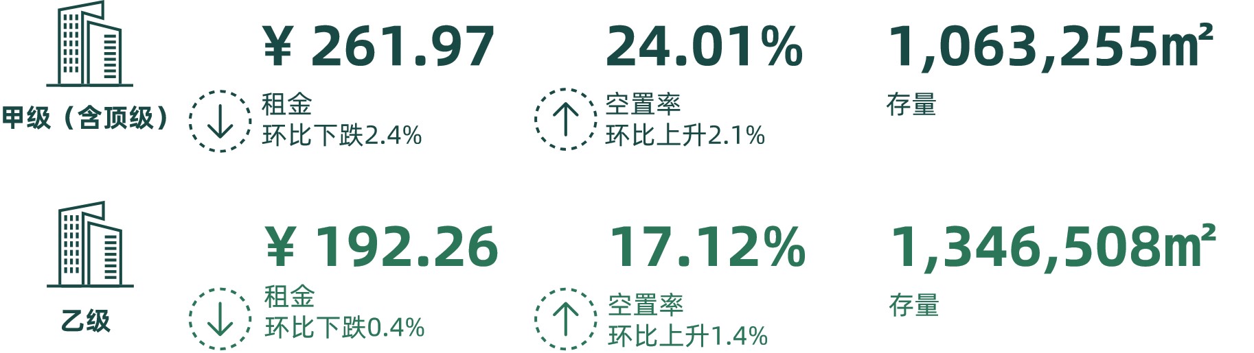 第三季度望京酒仙橋/商圈成交仍以科技類企業為主,但互聯網頭部企業由望京商圈退租導致該商圈空置率明顯上升,甲級(含頂級)及乙級寫字樓租金均呈現下降趨勢。望京/酒仙橋商圈,甲級(含頂級)寫字樓空置率上升2.1個百分點,租金較上季度環比下降2.4個百分點。乙級寫字樓空置率環比上升1.4個百分點,租金環比下降0.4個百分點。